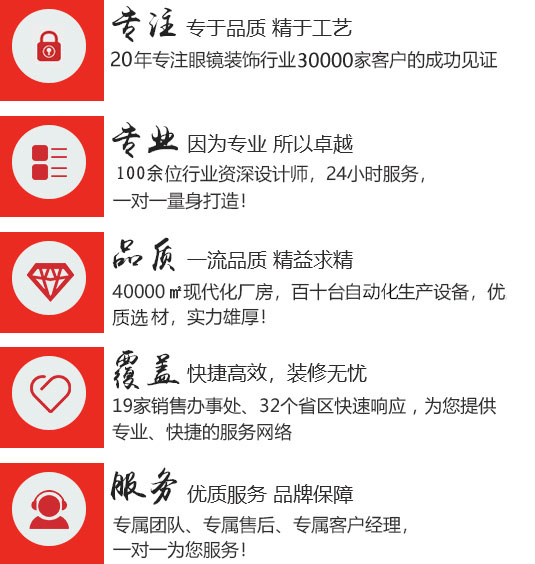 陽光視線是一家集設(shè)計(jì)、研發(fā)、生產(chǎn)、安裝、施工為一體的綜合性企業(yè)!20年專注服務(wù)于眼鏡行業(yè),擁有19個(gè)銷售網(wǎng)點(diǎn),遍布32個(gè)省份;500多名員工,其中設(shè)計(jì)研發(fā)、工程安裝、管理、營(yíng)銷、等中高級(jí)執(zhí)行人才160余名;2000平米的辦公環(huán)境;公司研發(fā)能力強(qiáng),并能迅速將研發(fā)成果轉(zhuǎn)化為生產(chǎn)與商業(yè)效益;擁有超具規(guī)模的展柜生產(chǎn)基地、生產(chǎn)流程、工藝技術(shù)以及生產(chǎn)設(shè)備。